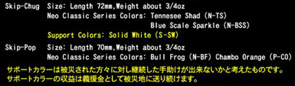 ブライトリバーの新作ルアーがリリースされます。 上アゴ出ているのがスキップチャグ、 下アゴ出ているのがスキップポップ( ^∇^)σお間違いなく☆ スキップチャグには ◎テネシーシャッド ◎ブルースケール・スパークル ◎ソリッドホワイト スキップポップには ◆ブルフロッグ ◆チャンボオレンジ がそれぞれ配色されています。4月初旬に入荷予定です。 税込み7350円、ご予約はメールにてお願いいたします。 スキップチャグの中に設定されている“ソリッドホワイト”には ブライトリバーから地震被災された方々に 向けての思いが込められています。 松本さん本人のコメントをご紹介します。 「サポートカラーというのは私たちが 東日本で被災されてい 何か継続したサポートができないか?と 考え製作 このルアーの収益は義援金として 被災地に |