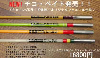 BPベイトのチコルアー対応ソリッドグラスロッド、全4色。