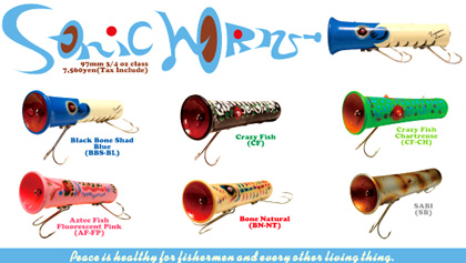 津波ルアーズの新作“ソニック・ホーン”のご予約開始です。 97㍉で3/4オンス、ラッカーフィニッシュ。 カラーは6色、左から ★ブラックボーンシャッド・ブルー ★クレイジーフィッシュ ★クレイジーフィッシュ・チャートリュース 右上へ ★アズテックフィッシュ・フローセントピンク ★ボーンナチュラル ★サビ 税込み7560円、ご予約はメールにてお願いいたします。 |