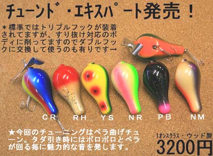 釣りビジョン「トップ道」で活躍のシングルスイッシャーはこの4色。 カラーは左から、 ●サンバースト ●ピンクヘッド×ライムグリーン ●ブルーヘッド ●ラスタ です。75ミリ、3/4オンス、ウッド製。 税込み4179円、予約・問い合わせはメールにて お願いいたします。12月中旬入荷予定です。 生産数に限りがありますので、ご要望にそえないケース がございます。ご了承くださいませ。 |