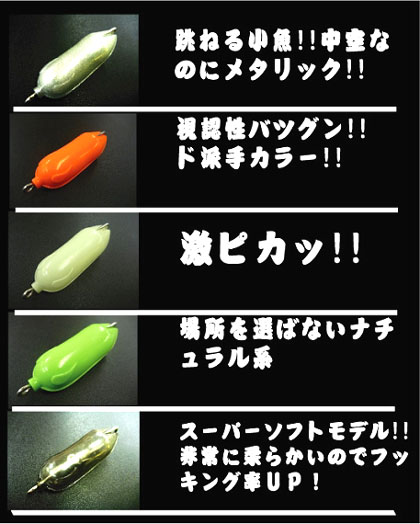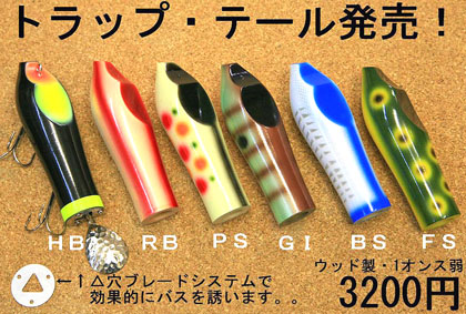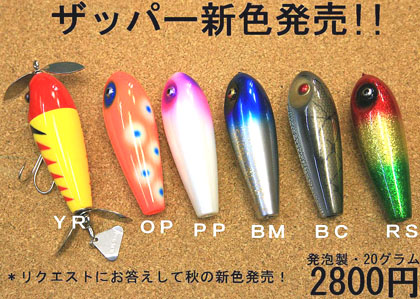 三角穴を金属にすることでカキンコキンと干渉音が発生、 ヘッドはダイブしそうな雰囲気満々のスプーンカット・2段面! もうひとつは人気の“ザッパー”新色登場"ヽ(´▽`)ノ" どれもこれも個性的なカラーリングで迷っちゃいます♪ 9月末の入荷予定、 予約・お問い合わせはメールにてお願いいたします。 |
