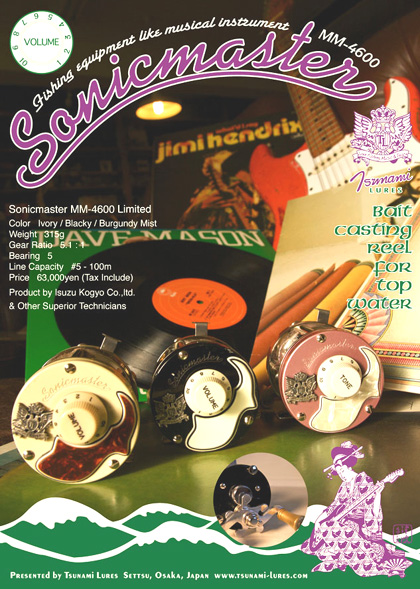 カラーチャートは左上から順に、 Tsunami Gill (TG) Tsunami Gill Black Head (TG-BH) Red Head (RH) Wave Head (WH) 右へ移って Organic Wave (OW) Psyche Frog (PF) Metal Scale All Silver (MS-AS) Tobacco Sunburst (TSB) 税込み7350円です。 そしてこちらは津波ルアーズ初の ベイトリール『Sonicmaster MM-4600 Limited』。 Color Ivory / Blacky / Burgundy Mist Weight 315g Gear Ratio 5.1 : 1 Bearing 5 Line Capacity #5 - 100m 税込み 63000円 予約・問い合わせはメールでお願いいたします。 |