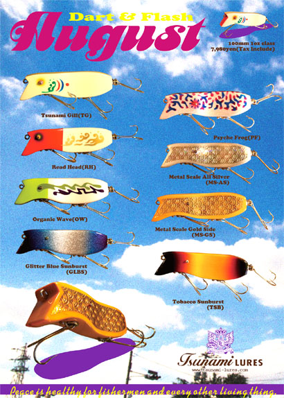 フラットサイドなダーターです。2月下旬発売予定。 本体全長 約100mm / 1oz class カラーは全8色、左上から下へ順に Tsunami Gill(TG) Red Head(RH) Organic Wave(OW) Glitter Blue Sunburst(GLBS) Psyche Frog(PF) Metal Scale All Silver(MS-AS) Metal Scale Gold Side(MS-GS) Tobacco Sunburst(TSB) 税込み価格は7980円、本日より予約スタートです。 メールにてご希望のカラーをお申し付けください。 |
