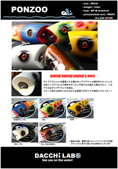 しっかりと水をたたくよう 作られています。 中のゼンマイもシッポも 交換パーツを用意するとのこと。 安心して使い込めますねー ルアーは使い込めるかどうかが生命線。 そのための耐久性、 そのための造形が問われます。 長持ちであること。 失われつつあるメイドインジャパンの良識の部分を このルアーを通して再度見つめ直してみましょう。 間違いなくエポックメイクです。 是非体感してください"ヽ(´▽`)ノ" http://jp.youtube.com/watch?v=-C8pCWFyuM8 |