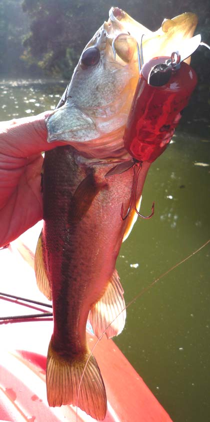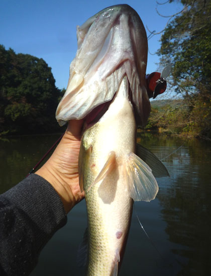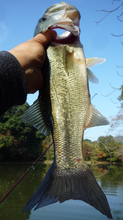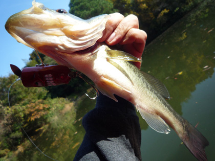 月日が経つのは早いですよねぇ~('-'*) 早朝イカ釣りのお客さまと別れて帰宅。 時間余っちゃったし、お昼過ぎまでバスやってみよっと。 せっかくだから、先日のガイド時に BPベイト『ザッパー』に施した“逆反りペラ”を 徹底的に試してみよう( ^∇^)σ これね。 ビルダー・森脇さんが製作している『SCUM LURES』の 試作3号機。パス・ヘッドな掘り込みが個性的で やや水没気味なウエイトバランスが冬向き、かな('-'*) 前ペラを通常と逆に反らしました、現場で手曲げね。 後ろペラは反らしナシ+ひねりのみ。 岸際にはキャストせずに 底に何か沈んでいる沖合いを攻めます。 水深は4メートルちょい切れくらい。 止めて、待って、ペラが 1周する程度にティップ上向きジャークして、 また止めて、の繰り返し。 同じ場所へ3投目、上向きジャークしたらすぐにッ!!! いやぁー、一瞬で持って行きましたねー(≧ヘ≦) イイ体格だなぁ~('-'*) Good Size!!! 長ーくて広い尾ひれ発育中。 まさに、冬を控えた秋バスのカタチ。 ベイトフィッシュ追いかけてるとこうなります。 これが釣れたってことは、 選択した場所はほぼ間違いじゃなかったってことかな。 小さめのは連発。やはり一段深いところからのロケットバイト。 こっちのルアーの動く範囲が小さいので バスにとってはいつでもかぶり付くチャンスがあります。 ときどき、こういうちょいマシなサイズのも混じります。 お腹ペシャンコ、 このタイプは秋バスの傾向が強く残っている証しで、 冬の越冬場所を見つけ出しているバスは お腹ぷっくり、なはず。ということは この付近には 越冬に適したディープ・カバーが存在しない! と判断しても かまわない(*^-^*)んじゃないかな。 今日みたいにちょっと暖かさを感じる日には バスが出張してくる場所なんでしょう。 こうやって、 冬にバス釣りを楽しめるポイントを 絞っていくんです☆だから今のうちにしっかり 釣りに行っておくというのは重要なんですよ~☆ |