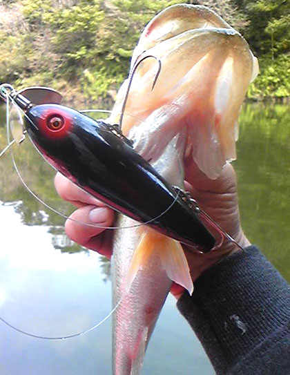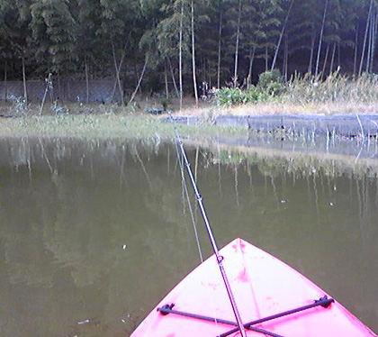 お客さまもカヤック('-'*) ボクもカヤックに乗って実施するガイドは 非常に快適でやりやすい☆もっと早く気づけばよかった。。。 案の定、岸際にはバスの姿がありません。 池は増水気味で濁り有り! となると・・ ハンプじゃなくて例のアレです、小枝冠水植物を探すパターン。 冠水小枝を見つけたものの、冷たい季節風の影響からか 崩れてしまってます。 ここにトップウォータープラグを放り込んでも 引っかかるだけ。 全体を見渡すと・・・ なにやら荒れて枯れた雰囲気、生命感がないです。 こういうときは グルッと360度まわりの景色を見回してみるんです。 その中に、 ★緑色の葉をまだ付けている植物 ★竹林 このふたつの要素が存在していれば、イッキに環境条件が 良くなるんですよ(=゚ω゚)ノ 緑色は生命感アップのしるしですし、 竹林はその根が水中に伸びていて 複雑なカバーを構成してくれるし、 辺りに染み出す水がろ過されて美しいんです。 水脈も多く湧き水が豊富になります。 あっ! ありましたねー( ^∇^)σ 竹林と水の間の植物もまだ緑色ですよ~ いきなり真ん中へぶち込むと、ルアーが引っかかって 場所を潰しちゃうケースがあるので 手前から撃っていくのがセオリー。 着水音静かに、丁寧にカバーに引っ掛けては外していきます。 プンッと外れたときにしっかりアピールするプラグがイイので、 ボクは回転レスポンスの優れたスイッシャーを用いています。 プンッと外れてクルクルピカピカッ☆ そのピカピカを目立たせるために ルアー本体のカラーに単色(ブラック)を選びました。 要は 主役はいつも ボディ本体ばかりではない! ということです(*^-^*) ペラが主、ボディ本体が従。 本体はペラをその場で浮かせ支えるために存在し、 ペラのフラッシングをもバックで際立たせている、 そういう役割のケースもあるということなんです。 で、( ^∇^)σ どぉぉーーーんっ ええ感じです(*^-^*) 肉付きも骨格もしっかりしてきました。冬対策進行中なんでしょう。 これからは季節風で緑色がどんどんなくなっていきます。 それでも緑を維持しているスポットがあったなら、 迷わず狙ってみてください。 竹林がそばにあったらなおバッチリ☆